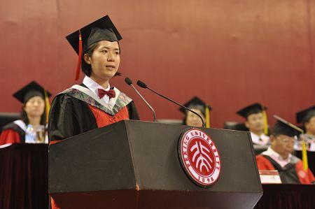 毕业生代表心理学系博士研究生高隽深情地回忆起自己在燕园生活和学习的点点滴滴,她谈到:“在毕业的时候,我总会想起十年的北大生活赋予了我什么?我们将带走什么?我想最重要的是,我学会用反思和批判的态度对待生活和自我,并郑重地对待自己的承诺。”在对一路陪伴我们的师长亲友表示诚挚的感谢以后,她借用婚礼誓词表达了自己对于北大和这段生活点滴记忆的珍视,并将带着回忆坚定而真诚的践行自己的人生。