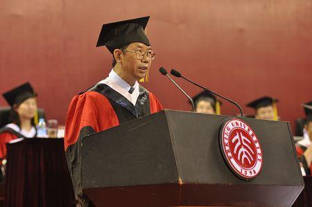 导师代表中文系系主任陈平原教授用风趣的话语回忆了二十多年前自己研究生毕业时的情景,并对广大毕业生殷切寄语三条:“第一,总有一天你会明白生命的极限,但我希望你们像鲁迅《野草》中的‘过客’一样,总有一个声音在呼唤着你,不要轻易停下追求的脚步;第二,你不是孤身一人上路,你的行囊里有一所百年名校的光荣和梦想,有着师长关切的目光;第三,当你成功时,母校为你祝贺,当你失败时,母校为你加油,当你遭遇挫折而屡败屡战时,母校为你鼓舞骄傲!”