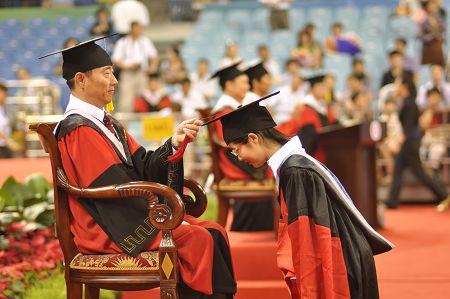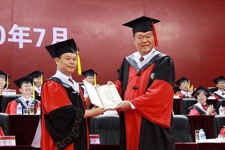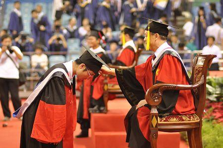伴着周校长最后一句“母校永远爱你们!”的深情呐喊,全场师生热烈欢呼,鼓掌不息,毕业典礼的气氛达到高潮。党委书记闵维方和周其凤校长授予2010届博士毕业生博士学位,以院系为单位授予2010届研究生毕业生硕士学位。各院系同学纷纷齐声呼喊口号,尽情表达心中的喜悦和对母校的感激、不舍、热爱。