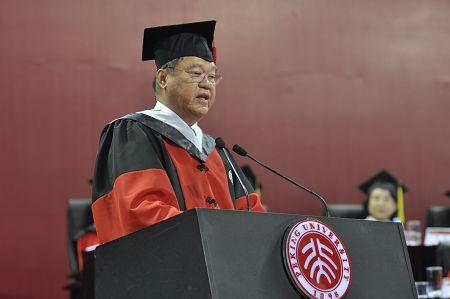 随后,周其凤校长为北大杰出校友,爱国华侨、金光集团董事长黄志源拨流苏,并授予荣誉博士证书。作为1968年毕业于北大数学力学系的老校友,黄志源先生与毕业生们分享了他丰富的人生经历和北大情怀。他讲述了自己将振兴民族造纸行业与民主进步、国家繁荣的使命结合起来的奋斗历程,并感谢北大给予自己敢为天下先的开阔胸襟和创造无限价值的理想。他告诫即将步入社会的青年人们:“要始终把国家、民族的利益放在第一位。责任比能力重要,做人比做事重要。”